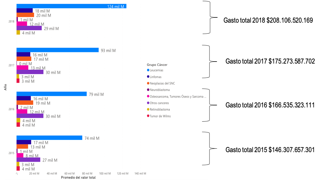 • En lo referente al gasto global en cáncer Infantil, se cuenta con información reportada por la CAC a la Dirección de Regulación de Beneficios Costos y Tarifas del Aseguramiento (en adelante DRBCT), desde el año 2015 hasta el año 2018, observándose un incremento en el gasto, el cual inicia en 2015 con un monto cercano a los 146 mil millones, en 2016 con un monto de 166 mil millones; en 2017 con un monto de 175 mil millones y en el 2018 llega a un monto de 208 mil millones. Ver Gráfica 2.