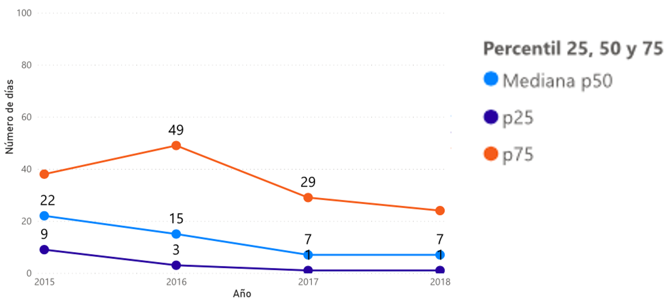 En 2015 el 75% de los niños fueron diagnosticados en menos de 22 días. En 2018 el 75% de los niños con cáncer fueron diagnosticados en menos de 7 días. |