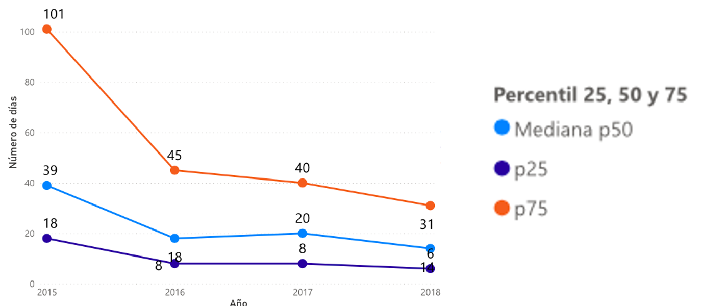 En cuanto a la oportunidad de la atención en cáncer infantil, según lo reportado por la Cuenta de Alto Costo (6) (en adelante CAC), al tomar el 75% de la población se encontró una disminución de 70 días entre la sospecha clínica y el diagnóstico de cáncer, mientras que la oportunidad entre el diagnóstico e inicio del tratamiento en el p75 (Medida estadísticamente conocida como Q3 o p75) disminuyó en 15 días entre el periodo 2015-2018 (7); hallazgos que estarían relacionados con las mejoras previamente descritas en la supervivencia de este grupo de patologías. Ver Grafica 1 a, y b:
