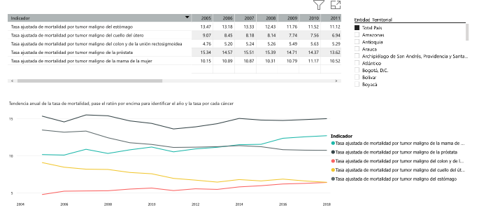 Acceda aquí al gráfico: Tasas crudas de mortalidad año a año desde 2005 hasta 2018 con base en Estadísticas Vitales, del Departamento Administrativo Nacional de Estadística –DANE, Mortalidad disponible entre 2005 y 2018, ocho tipos de cánecer incluídos.